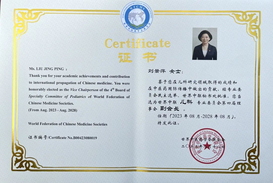 尊龙时凯药业集团党委书记、董事长刘景萍当选世界中医药学会联合会儿科专业委员会第四届理事会副会长